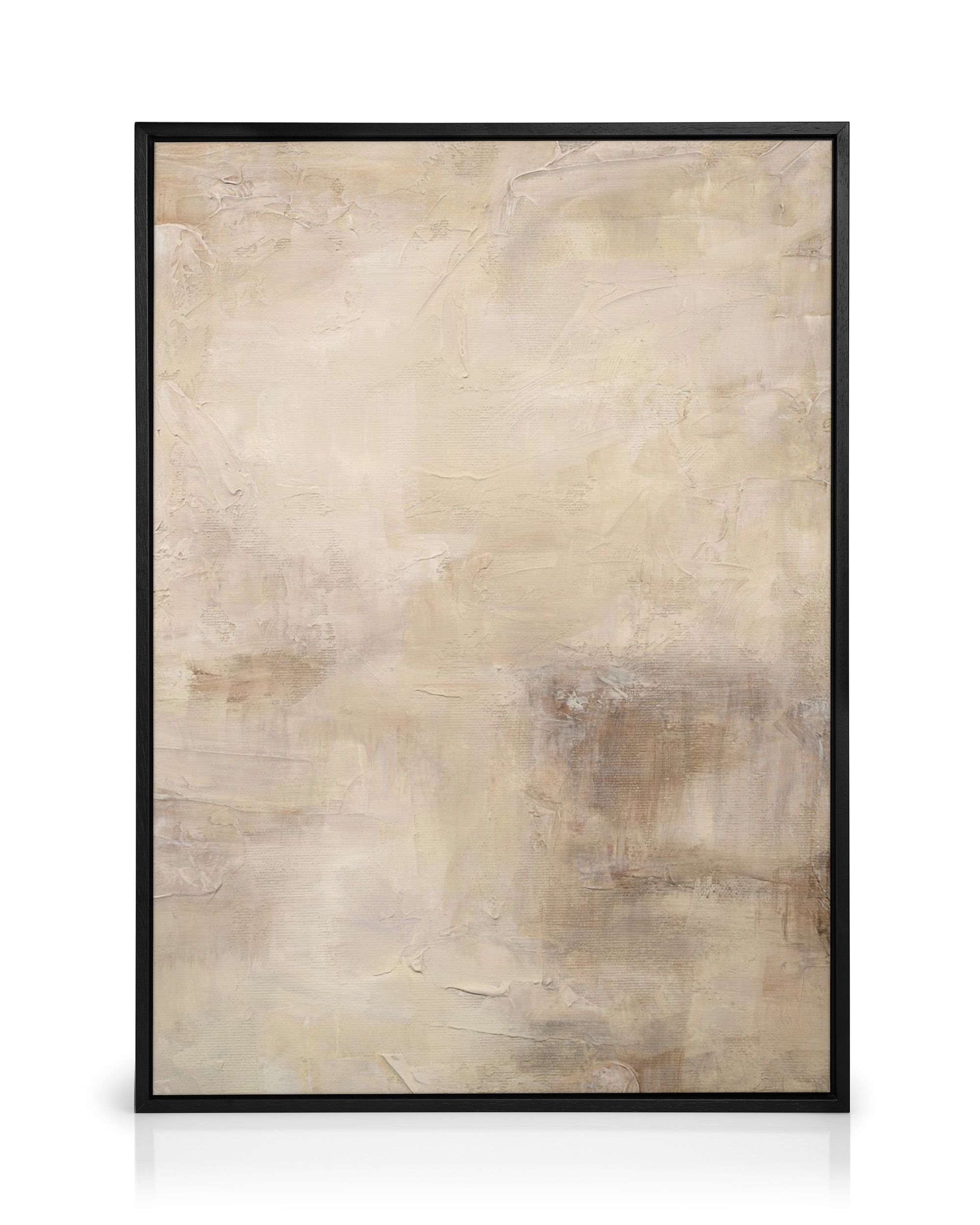Uma parede de quadros com três peças de arte: linhas onduladas pretas, um círculo meio preto e meio branco, e uma textura bege suave.