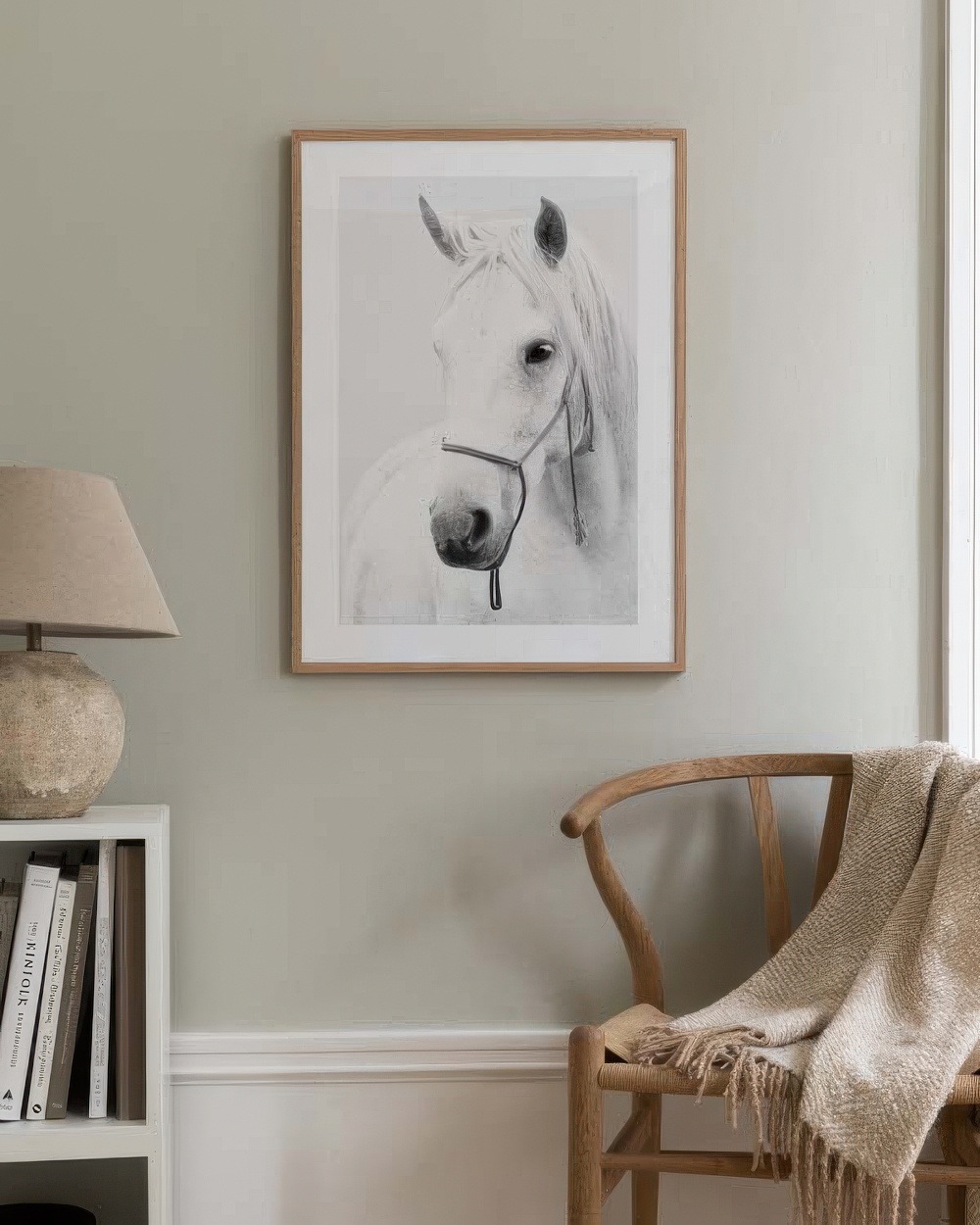 Quadro com fotografia de um cavalo branco como tema. Esta fotografia fica muito bem na decoração de qualquer casa. Pode combinar este quadro com outros para criar a sua própria collage de fotografias na parede! Dê uma vista de olhos à nossa categoria ‘Animais & Insetos’ para ver posters semelhantes.