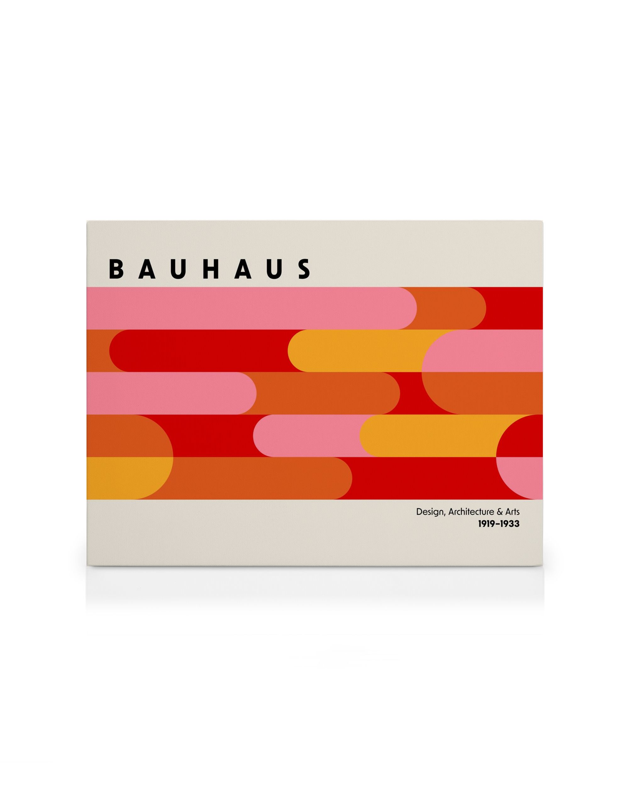 A partir de 7,80 €Uma tela decorativa Bauhaus com a palavra "BAUHAUS" em letras pretas e formas arredondadas coloridas em rosa, vermelho, laranja e amarelo sobre um fundo bege claro.