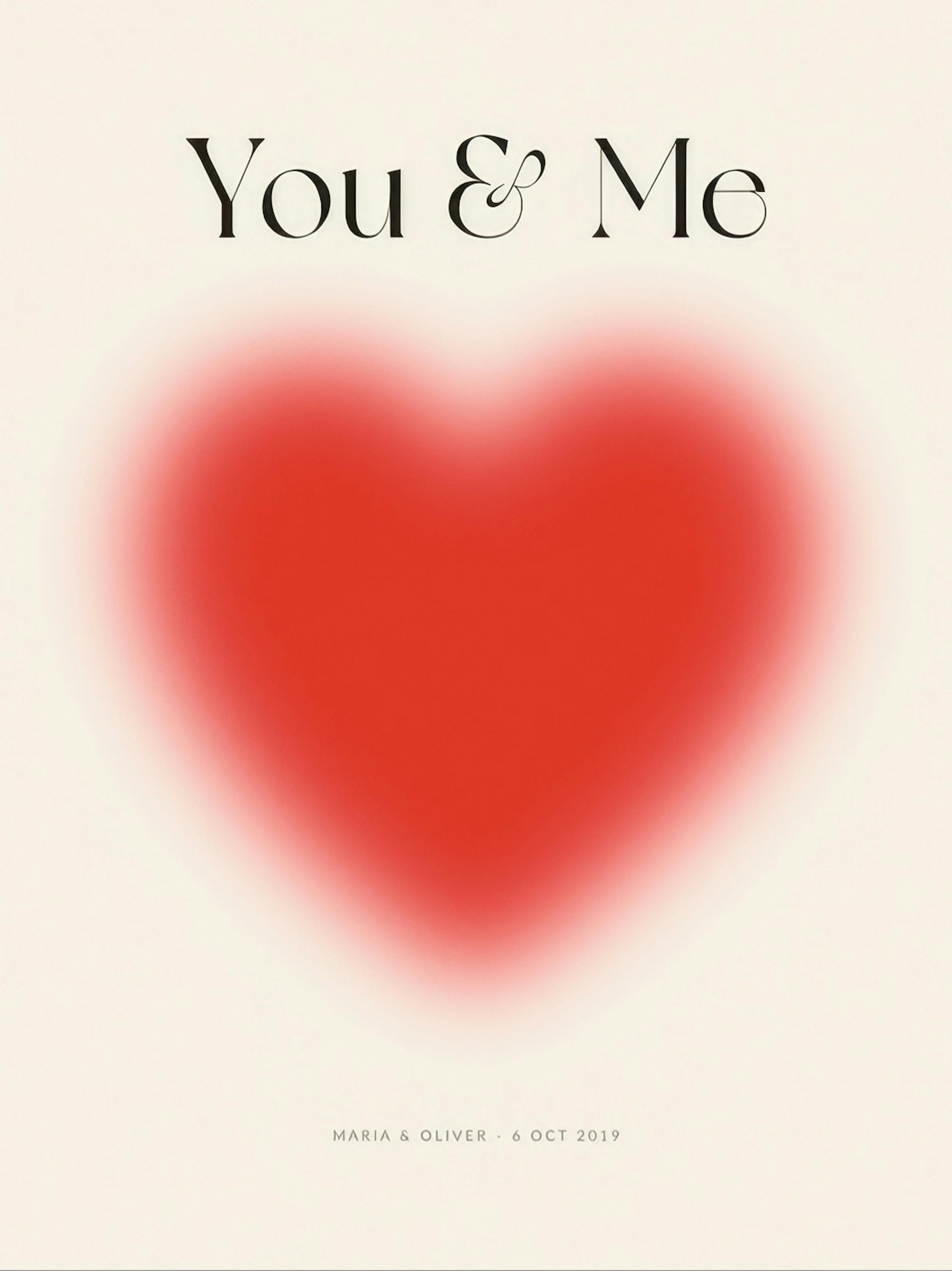 Poster de amor com o texto "You and me" e um grande coração vermelho por baixo. Com texto editável para que possa personalizar. Perfeito para oferecer como um presente adorável a alguém que ama.