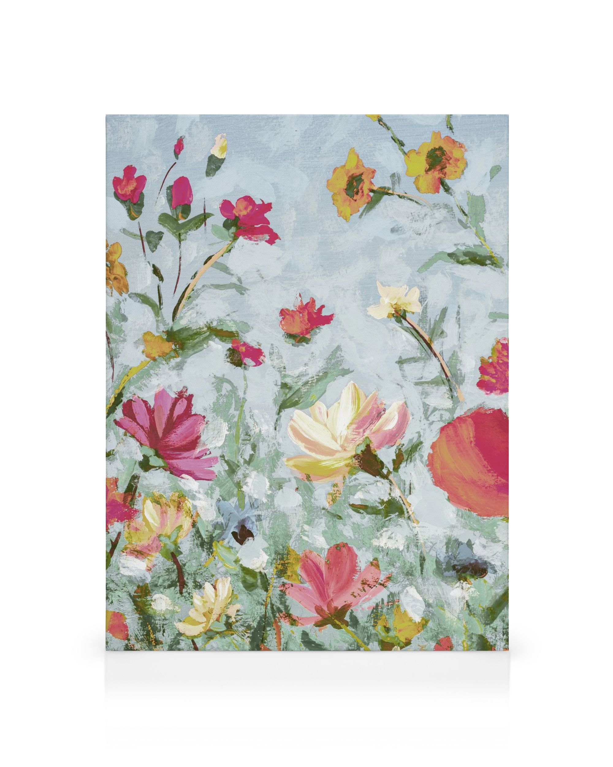 A partir de 24,95 €Tela decorativa com flores coloridas em tons de rosa, vermelho, amarelo e branco com folhas verdes, sobre um fundo azul claro. As pinceladas texturizadas criam uma arte botânica semi-abstrata para parede.