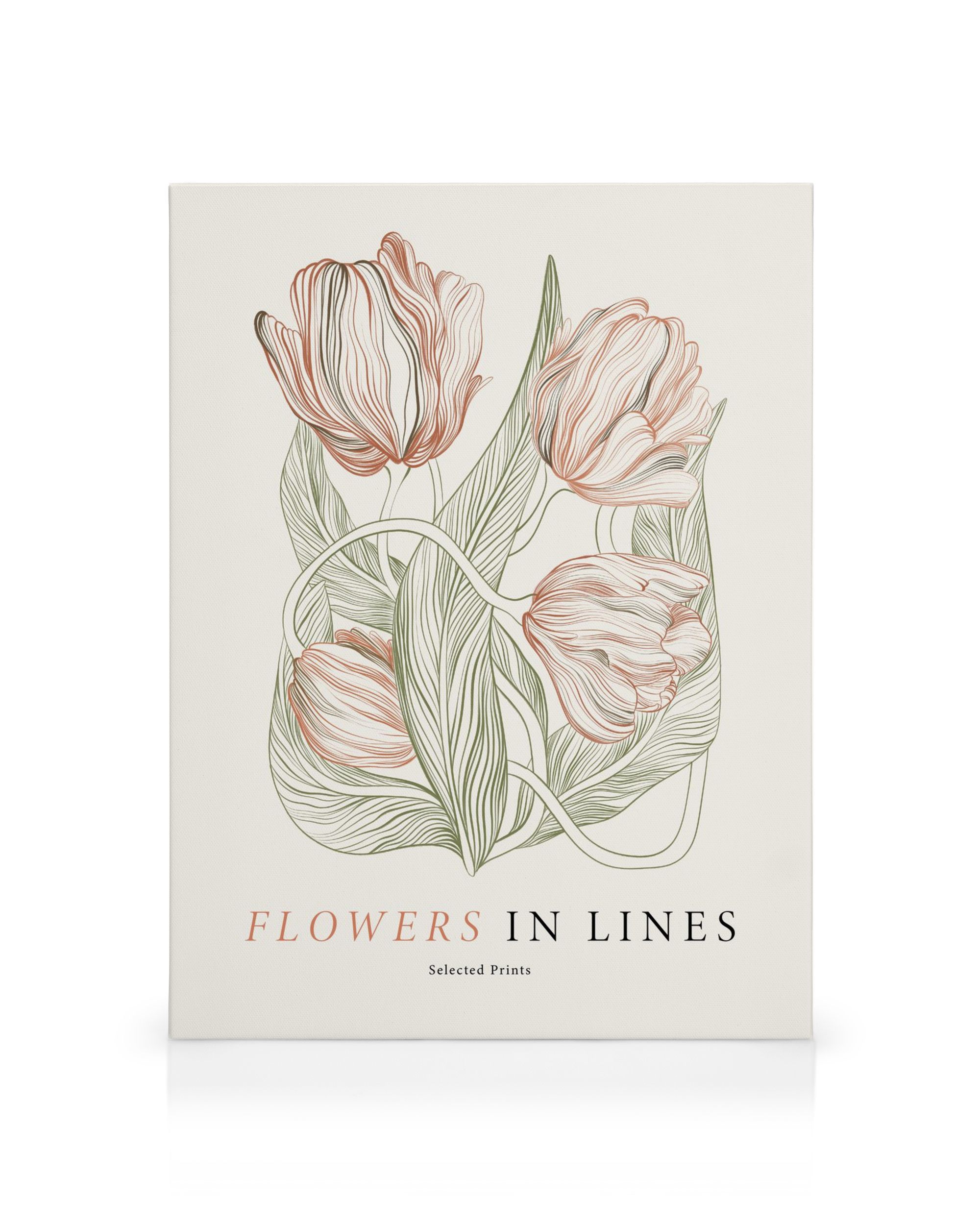 A partir de 24,95 €Uma impressão em tela decorativa simples e moderna apresentando três flores estilizadas de tulipa em rosa e branco em um fundo creme, acentuado com folhas e caules verdes. A arte de parede perfeita para sua casa ou parede de quadros.