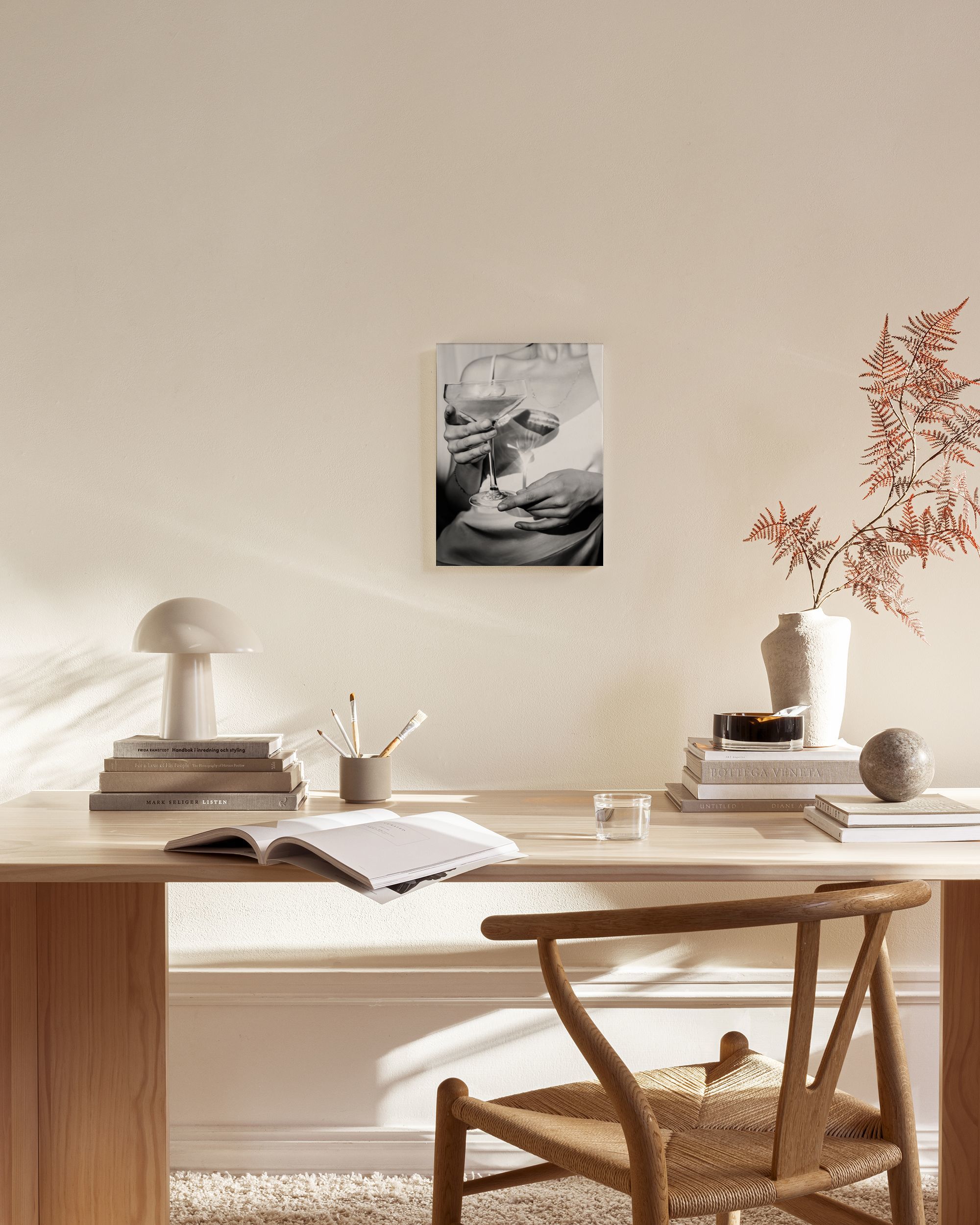 A partir de 24,95 €Uma impressão em tela decorativa em preto e branco de uma pessoa segurando um copo transparente. O fundo está artisticamente desfocado, destacando detalhes delicados, como o colar da pessoa e a alça.