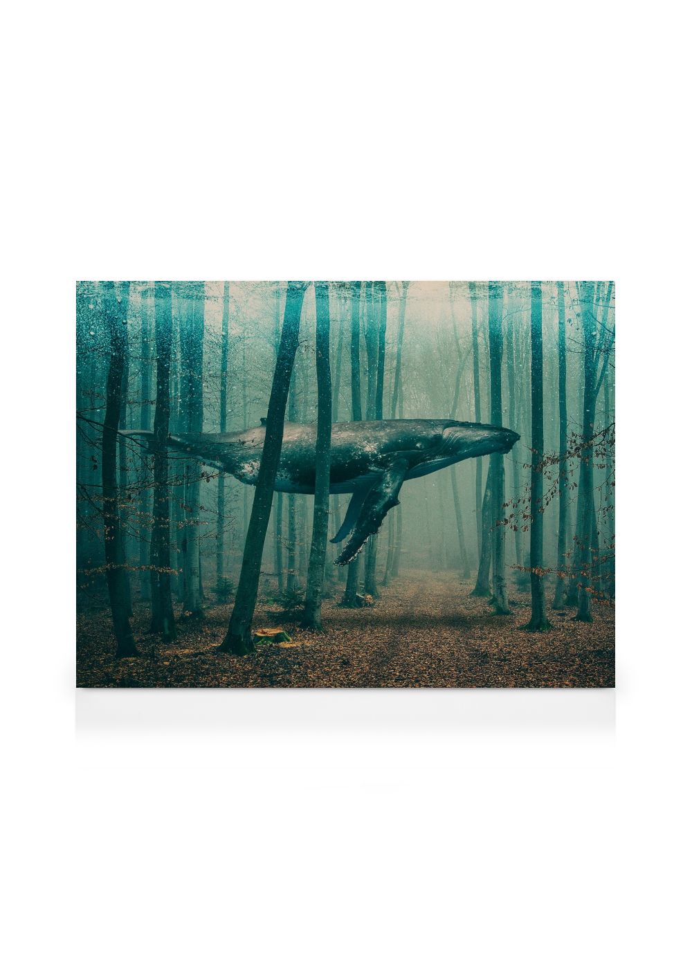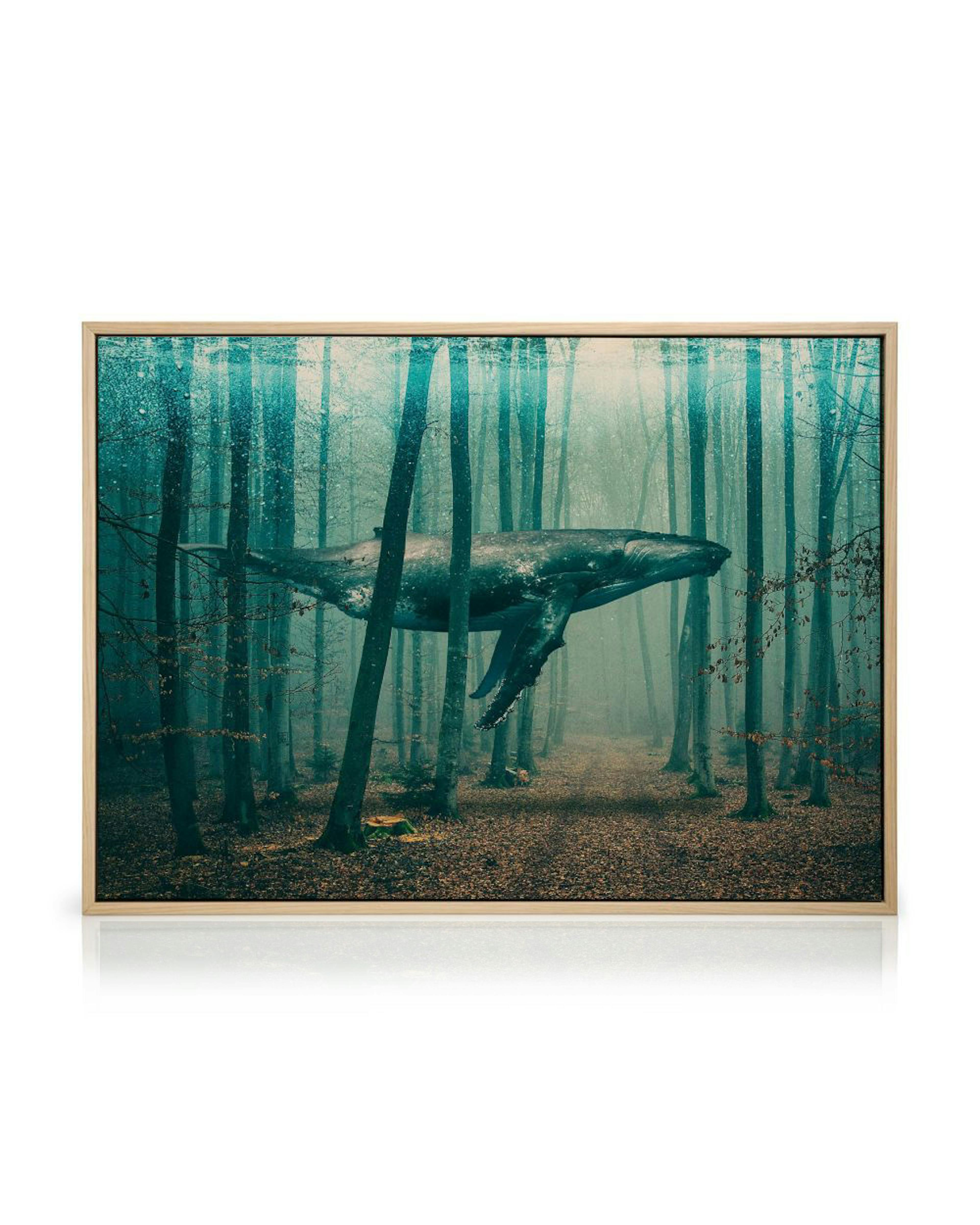 Tela decorativa surreal retratando uma baleia flutuando em uma floresta enevoada com árvores altas e nuas e folhas cobrindo o chão, em tons suaves de azul, verde e marrom. Esta arte de parede única mistura elementos do oceano e da floresta para criar uma peça onírica para sua parede de quadros.