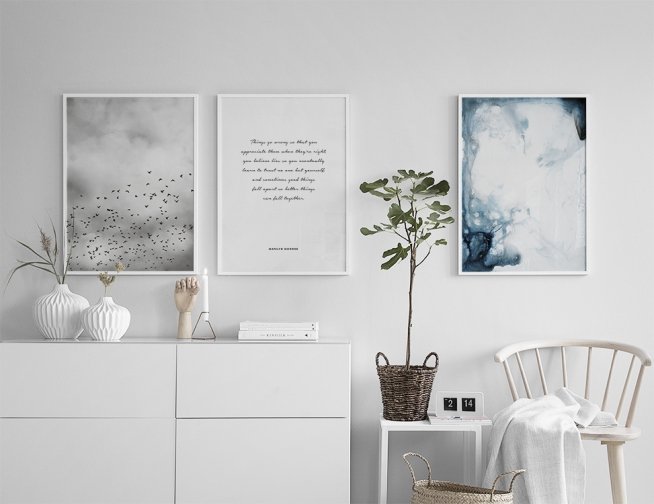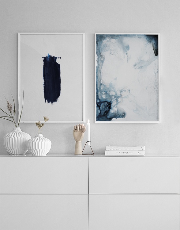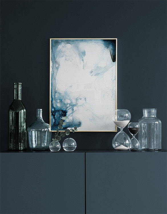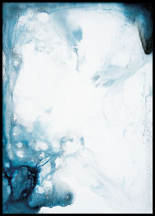 Temas da Escolha especial O tema é abstrato, formações em azul que fazem lembrar o mar. Um toque de calma que fica muito bem no quarto de dormir, por exemplo. O poster é baseado numa pintura, mantendo a estrutura da tela. Pode combinar numa collage de quadros, com outros posters e ilustrações do nosso vasto sortimento. O desenho é originalmente acrílico em tela, vendo-se bem a estrutura da tela!