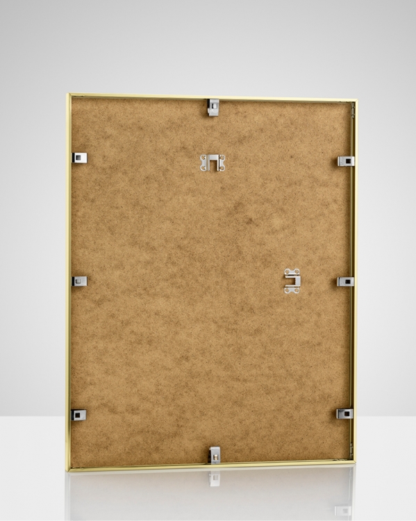 Moldura de metal dourado medindo 40x50 cm feita de alumínio dourado. A nossa moldura de metal dourado é equipada com um vidro acrílico leve e inquebrável. O vidro acrílico é protegido em ambos os lados por uma película protetora que deve ser removida antes do uso. Esta moldura está equipada com dois ganchos de metal na parte traseira, para permitir a colocação vertical e horizontal na parede. A moldura abre na parte de trás usando os clipes de metal, facilitando assim o enquadramento da sua arte.