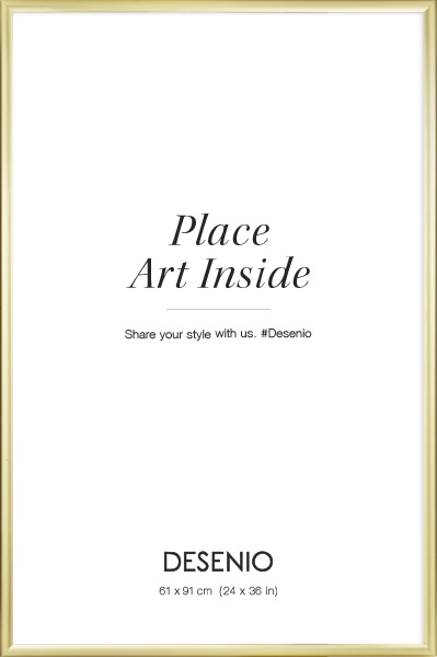 Moldura de metal dourado 70x100 cm feita de alumínio dourado. A nossa moldura de metal dourado é equipada com um vidro acrílico leve e inquebrável. O vidro acrílico é protegido em ambos os lados por uma película protetora que deve ser removida antes do uso. Esta moldura está equipada com dois ganchos de metal na parte traseira, para permitir a colocação vertical e horizontal na parede. A moldura abre na parte de trás usando os clipes de metal, facilitando assim o enquadramento da sua arte.
