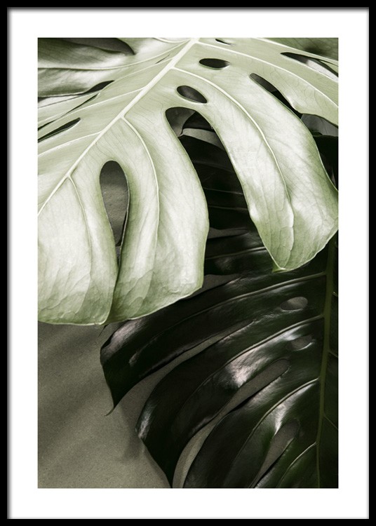 Temas da Escolha especial Fotografia de duas folhas de monstera em verde claro e verde escuro. Esta bonita planta fica tão bem numa impressão como num vaso, e são mais facéis de se manter vivas desta forma. Opte por adicionar algumas impressões verdes de monstera para trazer mais vida à sua casa!