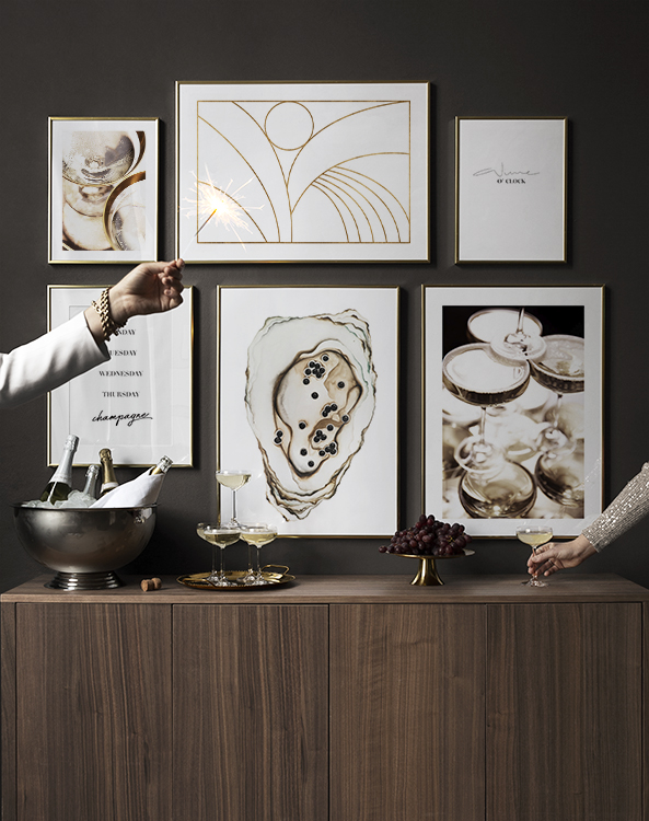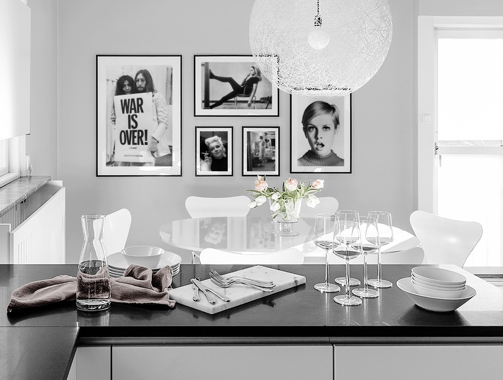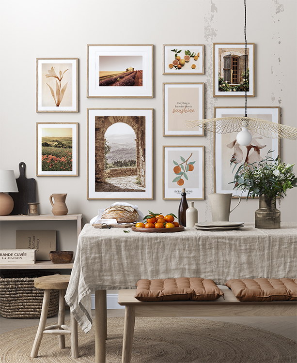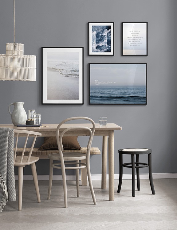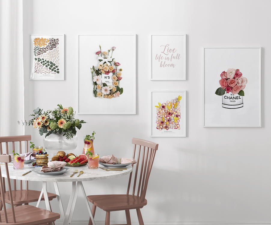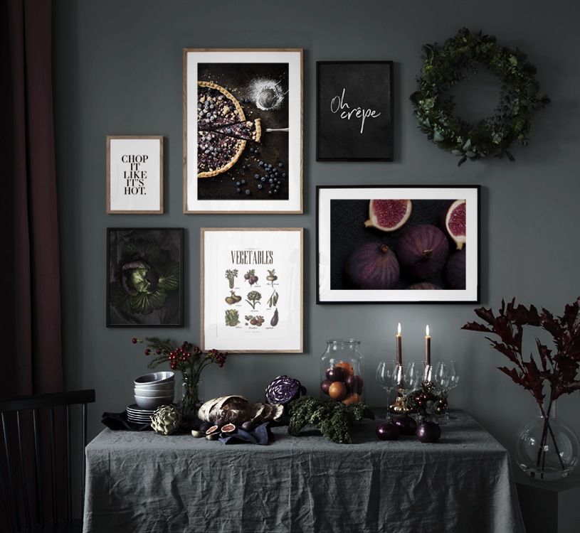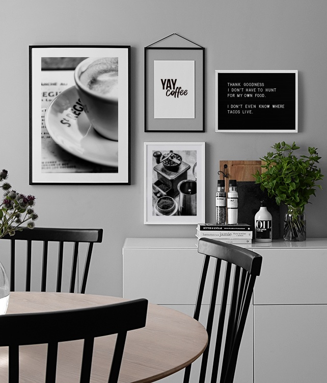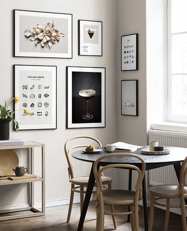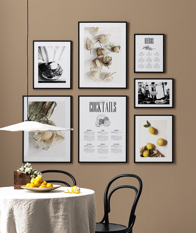 Usar arte para decorar a cozinha é uma forma acessível e eficaz de a modernizar e lhe dar vida. Criámos composições e misturas de posters e imagens diversas, que ficam perfeitamente bem na cozinha ou na sala de jantar. Na cozinha gostamos muito de usar posters e designs com o tema da comida, como fotografias de ervas aromáticas frescas, receitas de cocktails frescos ou uma citação divertida.