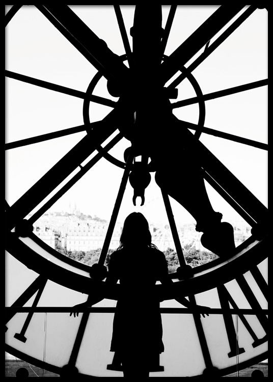 A partir de 24,95 €Uma imagem parisiense a preto e branco de uma rapariga a olhar a cidade através do grande relógio do Musée d'Orsay. Esta foto eterna a preto e branco, com inspiração vintage, é uma das várias imagens de Paris da coleção Studio Cosmopolitan, feita pelos criativos da Desenio.